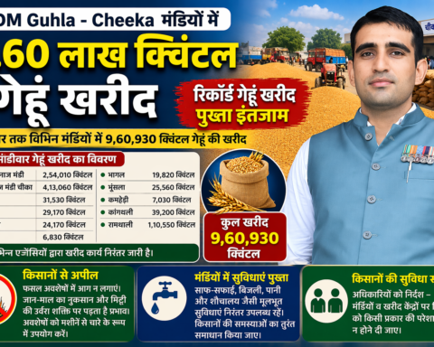 रिकॉर्ड गेहूं खरीद, पुख्ता इंतजाम – SDM Guhla गुहला-चीका, 15 अप्रैल। SDM Guhla कैप्टन प्रमेश सिंह ने बताया कि क्षेत्र में गेहूं खरीद सुचारू रूप से चल रही है। मंगलवार तक विभिन्न मंडियों में 9,60,930 क्विंटल गेहूं की खरीद हो