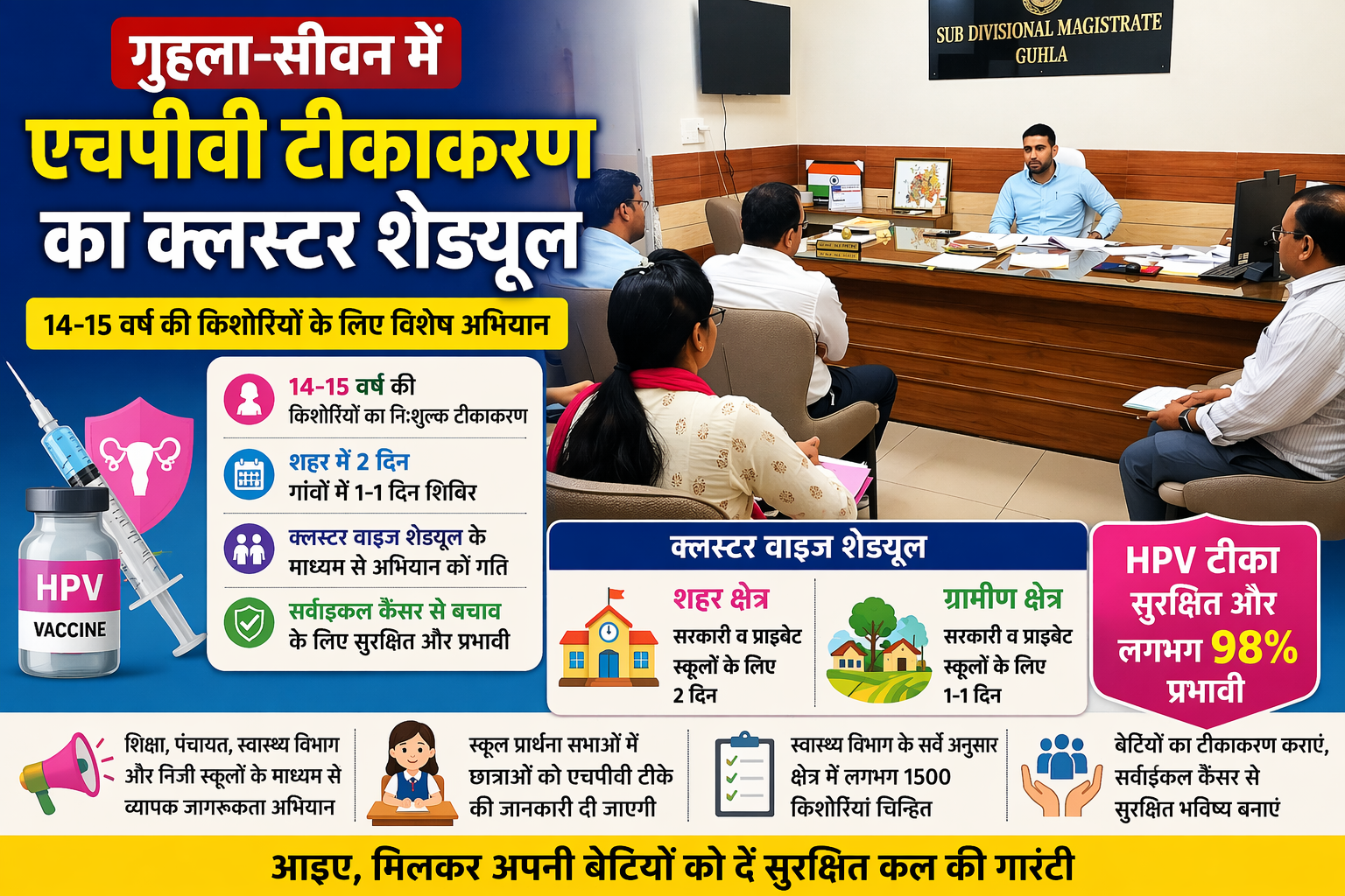 गुहला-चीका, 13 अप्रैल। एसडीएम कैप्टन प्रमेश सिंह ने निर्देश दिए कि सरकारी व प्राइवेट स्कूलों का क्लस्टर वाइज शेड्यूल बनाकर एचपीवी (ह्यूमन पैपिलोमा वायरस) टीकाकरण अभियान को गति दी जाए। शहर में दो दिन और ग्रामीण क्षेत्रों में एक-एक दिन शिविर लगाए जाएंगे।