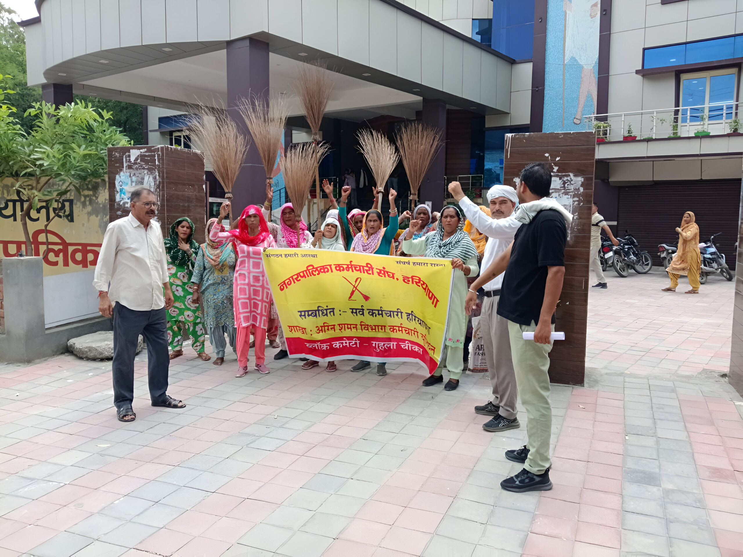 Cheeka, August 20 – The Municipal Employees Union, Haryana, affiliated with the Sarv Karamchari Sangh, held a massive protest in Cheeka on Tuesday against the state government’s alleged betrayal of promises. Employees from the municipality and fire brigade joined the demonstration, raising strong slogans against the government.